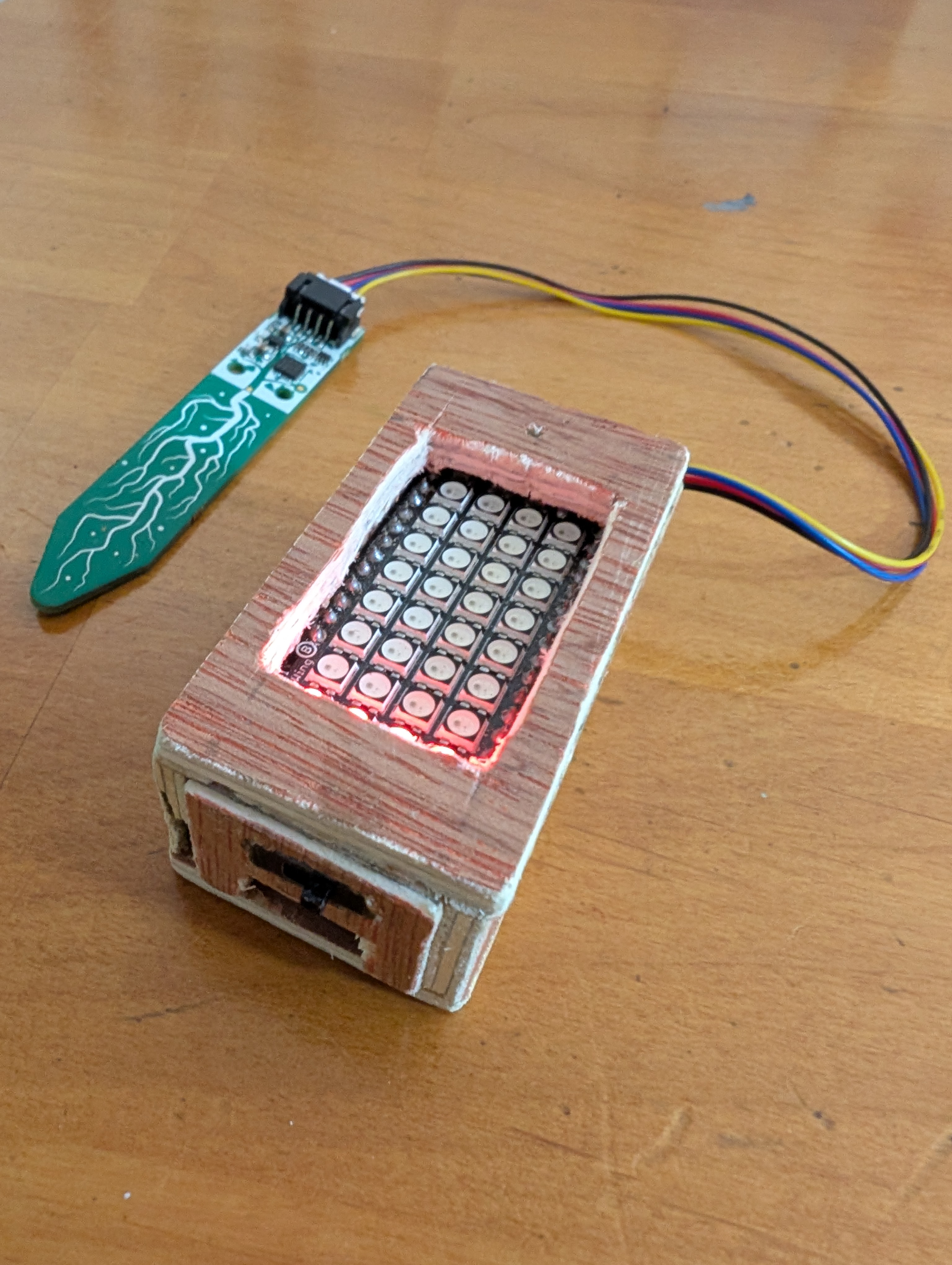 Built this soil moisture sensor for my wife as a high-tech replacement for one of those resistance-sensing soil moisture sensors that you can buy at hardware stores. Uses an microcontroller connected to a Neopixel panel that I have programmed (using CircuitPython) to track moisture content. You can see it in action in the movie below. I will post the design to Adafruit Playground at some point.
